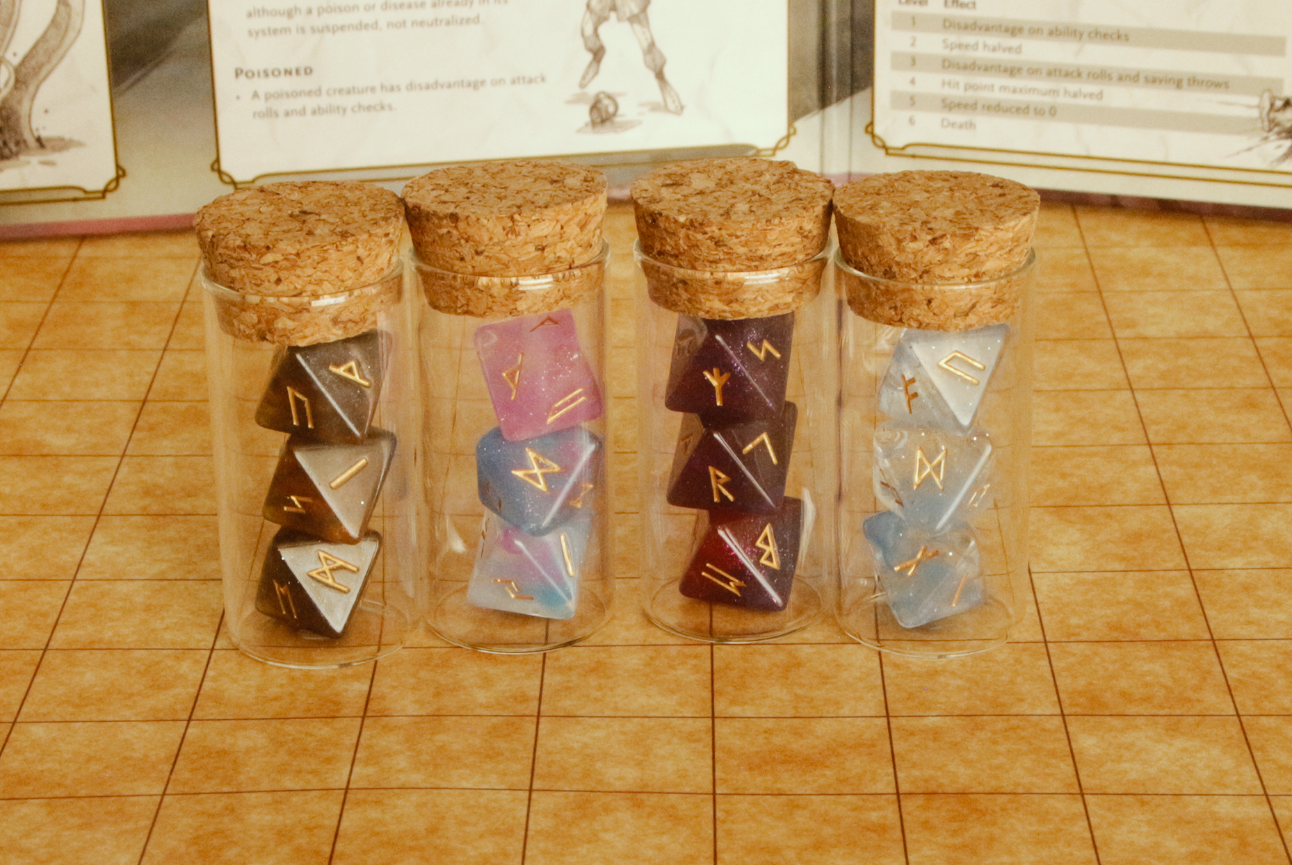 Ever need some random runes for your puzzles? Need some mysterious symbols for your world building? Or maybe you just like the Elder Futhark! If so, then these are the dice for you! A beautiful set of 3d8 dice featuring runes from the Elder Futhark in a corked glass jar. The jars are made from a durable glass with a resealable cork.